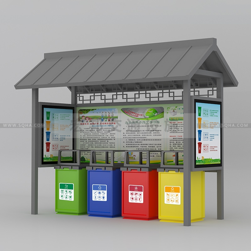 目前,生活垃圾分類收集是城市生活垃圾處置的主流趨勢(shì),也是現(xiàn)代城市文明進(jìn)步的標(biāo)志之一,有利于提升垃圾清運(yùn)效率,便于再生資源的回收利用,減少環(huán)境污染,減少環(huán)衛(wèi)工人常規(guī)保潔的壓力。垃圾分類亭,分為地基基礎(chǔ)設(shè)施、公益宣傳欄、立柱、頂棚等,亭內(nèi)設(shè)置可回收、有害垃圾、廚房垃圾和其他垃圾等垃圾桶,垃圾桶及宣傳欄配有垃圾分類的宣傳標(biāo)語,廣大群眾可以根據(jù)垃圾桶的提示標(biāo)語,將廢棄的生活垃圾投放到對(duì)應(yīng)的垃圾桶中。